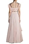 Featuring a light pink blouse in chanderi and net base with multi colored embroidery and feather detailing. It is paired with a matching drape lehenga skirt in chiffon base.