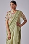 Featuring a mint green draped saree in chiffon organza base with ruffles. It is paired with a contrasting net embroidered blouse. Accentuate it with statement jewellery and heels for weddings or festive occasions.