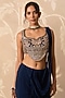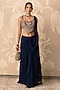 Featuring a navy blue draped saree in chiffon base. It is paired with a net embroidered blouse having a back tie-up detail. Style it with statement jewellery, bold heels and a metallic clutch for a striking edge, Perfect for a wedding, sangeet or engagement ceremonies.