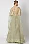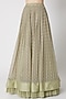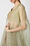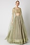 Featuring an olive green blouse in raw silk base with embroidery. It is paired with a matching printed ruched lehenga in chiffon base having net detailing and a scallop organza cape.