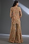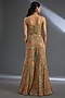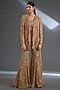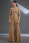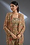 Featuring an olive green in georgette base with print. It is paired with a bustier having print and embroidery, including pants. Accentuate with statement jewellery and heels for a festive occasion.