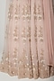 Featuring a peachy pink blouse in net base with floral embroidery. It is paired with a matching lehenga and draped dupatta.