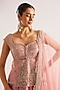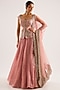 Featuring a pink peplum in tissue base with embroidery. It is paired with a tissue lehenga and a net embroidered dupatta. Accentuate it with zircon jewellery and embellished heels for a sangeet or wedding ceremony.