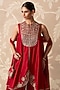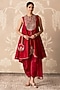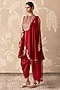 Featuring a red kalidar kurta in chanderi base with embroidery. It is paired with draped salwar pants and a net embroidered dupatta. Style it with statement earrings, bold heels and a metallic clutch for a striking edge, Perfect for a festive occasion, sangeet or evening celebrations.