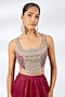 Featuring a red lehenga in organza base. It is paired with a net back tie-up embroidered blouse and a net ruffled dupatta. Accentuate it with statement jewellery and heels for festive occasions or wedding ceremony.
