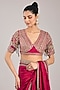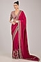 Featuring a red saree in silk base with embroidery. It is paired with a raw silk embroidered blouse and a crepe underskirt. Accentuate it with dangler earrings and heels for a festive occasion, wedding or engagement ceremony.