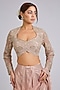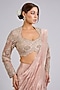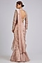 Featuring a rose gold draped stitched saree in tissue base. It is paired with a net embroidered blouse. Accentuate it with zircon jewellery, embellished heels and a potli bag for a complete look. Perfect wear for an engagement or sangeet ceremony.