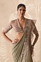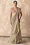 Featuring a sage green pre-stitched draped saree in chiffon and organza base with embroidery. It is paired with a net and kota embroidered blouse. Style it with statement earrings, bold heels and a metallic clutch for a striking edge, Perfect for a wedding, mehendi, engagement parties, or glamorous evening celebrations.