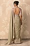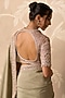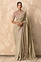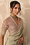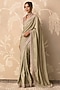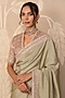 Featuring a sage green saree in silk base with embroidery. It is paired with a net and kota tissue embroidered blouse and a crepe underskirt. Style it with statement earrings, bold heels and a metallic clutch for a striking edge, Perfect for a wedding, mehendi, engagement parties, or glamorous evening celebrations.