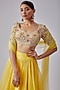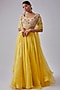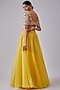 Featuring a yellow lehenga in organza base. It is paired with a matching net embroidered blouse and a dupatta.