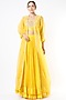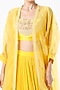 Featuring a yellow ruched lehenga in chiffon base. It is paired with a matching mirror embroidered blouse and an organza kimono cape.