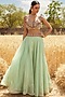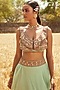 Featuring an aqua green bustier in organza base with hand and machine embroidery. It is paired with a matching high-waisted lehenga.