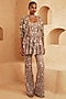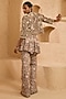Featuring a beige peplum in net and organza base with 3D floral hand embroidery. It is paired with pants and a cape. Accentuate it with zircon jewellery and heels for festive celebrations or sangeet ceremony.