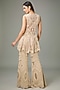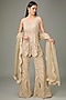 Featuring a beige peplum kurta in pure organza and net base with hand and machine work. It is paired with silk scalloped sharara pants and a dupatta. Accentuate it with statement earrings and heels for an engagement or a wedding ceremony.