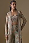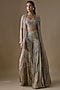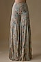 Featuring a grey jacket in chiffon and organza base. It is paired with a blouse and sharara pants. Style it with dangler earrings and heels for a wedding, sangeet or engagement ceremony.