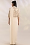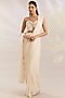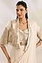 Featuring an ivory saree in net and chiffon base. It is paired with an embroidered blouse and a jacket. Accentuate it with emerald or zircon jewellery, strappy heels and a clutch for a sangeet or reception ceremony.