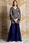 Featuring a navy blue short kurta in organza base with hand and machine embroidery. It is paired with matching sharara pants and a dupatta.