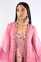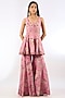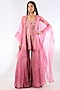 Featuring a pink peplum top in chanderi base with floral print and embroidery. It is paired with flared pants and a sheer organza cape. Accentuate it with jewellery and heels for festive occasions or wedding ceremonies.