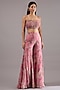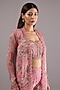 Featuring a pink jacket in chiffon and organza base with floral motif and floral embellishments. It is paired with a bustier and high-waisted sharara pants. Accentuate the designer sharara with silver or pearl jewellery, embellished heels and a clutch for a wedding or sangeet ceremony.