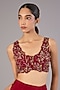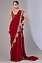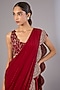 Featuring a red saree in chiffon and organza. It is paired with a blouse. Accentuate it with statement earrings and embellished heels for a festive occasion, wedding or engagement ceremony.