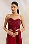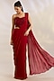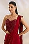 Featuring a red saree in net and chiffon base. It is paired with an embroidered blouse. Accentuate it with swarovski jewellery, block heels and a clutch for a sangeet or cocktail ceremony.
