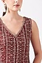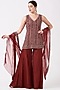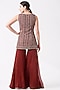 Featuring a reddish maroon kurta in silk base with aari hand embroidery. It is paired with matching sharara pants and an organza dupatta.