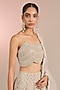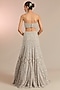 Featuring a silver lehenga in net and organza base. It is paired with a blouse and and a dupatta. Accentuate it with pearl jewellery, embellished heels and a clutch for engagement wedding ceremony.
