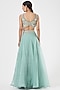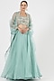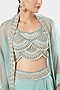 Featuring a sky blue lehenga in organza and tulle base with hand embroidery. It is paired with a matching blouse having pearl embroidery and a jacket.