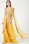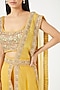 Featuring a sunshine yellow scalloped blouse in organza base with multi-colored thread embroidery. It is paired with matching sharara pants and a tie-up dupatta.