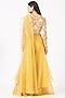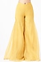 Featuring a sunshine yellow scalloped blouse in organza base with zardosi and thread embroidery. It is paired with matching sharara pants and a tie-up dupatta. Perfect wear for festive occasions, haldi or wedding ceremonies.