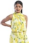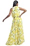 Featuring a white dress in crepe modal base with yellow print and belt.