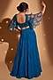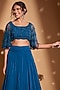 Featuring a peacock blue gathered skirt in georgette base. It is paired with a net sheer bustier having tassels and scalloped hand embroidery. Accentuate it with earrings and heels for festive occasions or wedding ceremonies.