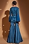 Featuring a peacock blue jacket tunic in net base with cutwork hand embroidery and pleated bell sleeves. It is paired with silk satin gharara pants. Accentuate it with earrings and heels for festive occasions or wedding ceremonies.