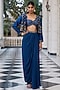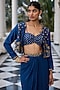 Featuring a deep blue jacket in raw silk, shantoon and georgette base with hand embroidery. It is paired with a bustier top and a skirt. Accentuate it with statement earrings and heels for a festive occasion, sangeet ceremony or cocktail.