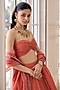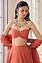 Featuring a soft orange lehenga in dupion silk, organza and shantoon base with crystal hand embroidery. It is paired with a twisted bustier and a dupatta. Accentuate it with statement jewellery and heels for a sangeet or engagement ceremony.