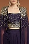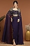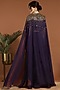 Featuring a purple cape in organza and silk base with hand embroidery. It is paired with an embroidered bustier and a draped dhoti skirt. Accentuate it with statement earrings and heels for a festive occasion.