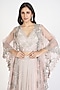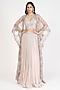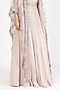 Featuring a blush pink cape in organza and crepe base with embellishments. It is paired with a lehenga and a bustier. Accentuate with statement jewellery and heels for a wedding or sangeet ceremony.