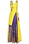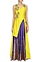 This set features a canary yellow asymmetric fusion jacket in silk base with floral zardozi embroidery on the front and semi circular back. It has traditional rajasthani tassel detailing. It comes with a mellow down purple banarasi woven panelled floor length skirt.