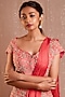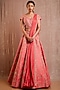 Featuring a coral lehenga in raw silk and silk base with zardosi embroidery. It is paired with a matching blouse having cut work and a pleated crossbody drape.