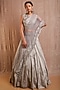 Featuring a grey lehenga in silk and net base with zardosi work. It is paired with a matching blouse and a crossbody dupatta having stripes detailing and cut work.