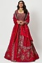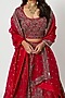 Featuring a red lehenga in raw silk and organza base with floral motifs and geometric embellishments. It is paired with a matching embroidered blouse and an organza dupatta.