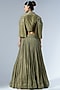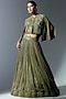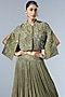 Featuring a sage green cape-style jacket in crepe base with embroidery. It is paired with a bustier and a pleated lehenga. Accentuate it with statement earrings and heels for a festive occasion or mehendi ceremony.