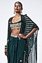 Featuring a bottle green cape in crepe and organza base with sequins hand embroidery. It is paired with an embroidered bralette and a skirt. Accentuate it with statement earrings, a clutch bag and metallic heels for festive occasions, sangeet or mehendi ceremony.