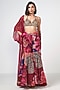 Featuring a cherry red cape in organza and georgette base with cutwork embroidery. It is paired with a blouse and a skirt. Accentuate it with statement jewellery, a clutch bag and block heels for festive occasions, sangeet or engagement ceremony.
