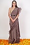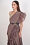 Featuring a copper pre-draped saree in crepe base with flared organza ruffles. It is paired with a matching heavy blouse and a belt.