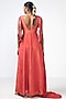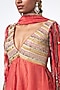 Featuring a coral anarkali in tissue and georgette base with applique embroidery. It is paired with pants and a dupatta. Accentuate it with statement earrings, a clutch bag and metallic heels for festive occasions or sangeet ceremony.