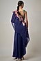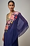Featuring an electric blue cape in organza base with crystals, coins and cutdana details, including applique embroidery. It is paired with a blouse and a draped skirt. Accentuate it with statement earrings and heels for festive occasions.