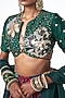 Featuring an emerald green blouse in crepe, organza and satin base with applique embroidery. It is paired with a skirt and a dupatta. Accentuate it with a chunky statement earrings, a clutch bag and metallic heels for festive occasions, sangeet or engagement ceremony.