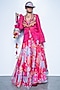 Featuring a fuchsia pink jacket in organza base with embellishment. It is paired with a blouse and a floral printed skirt. Accentuate it with statement earrings and heels for pre-wedding events.
