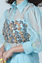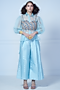 Featuring ice blue pleated pants in imported silk base. It is paired with a matching organza shirt and an embellished blouse.